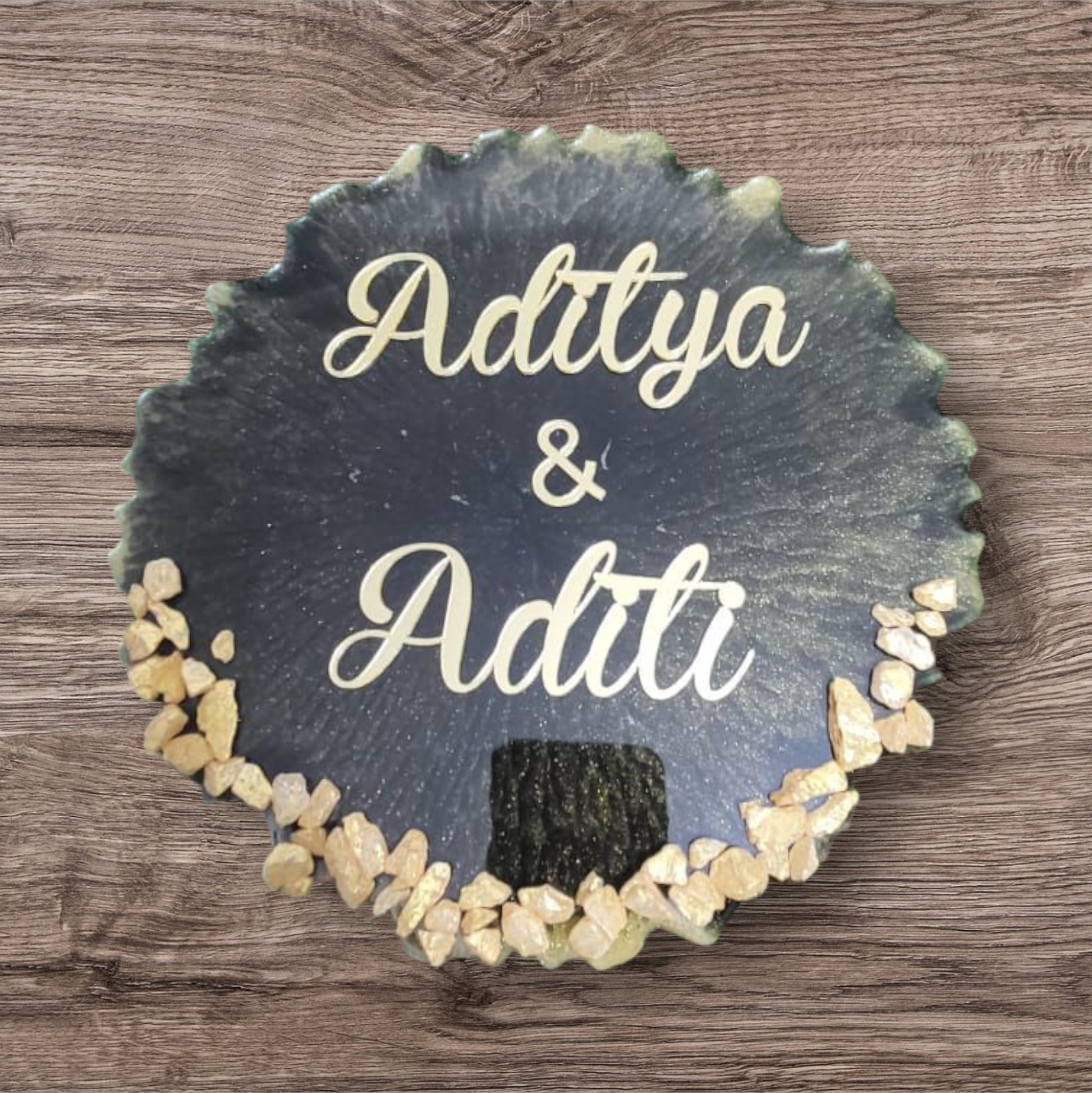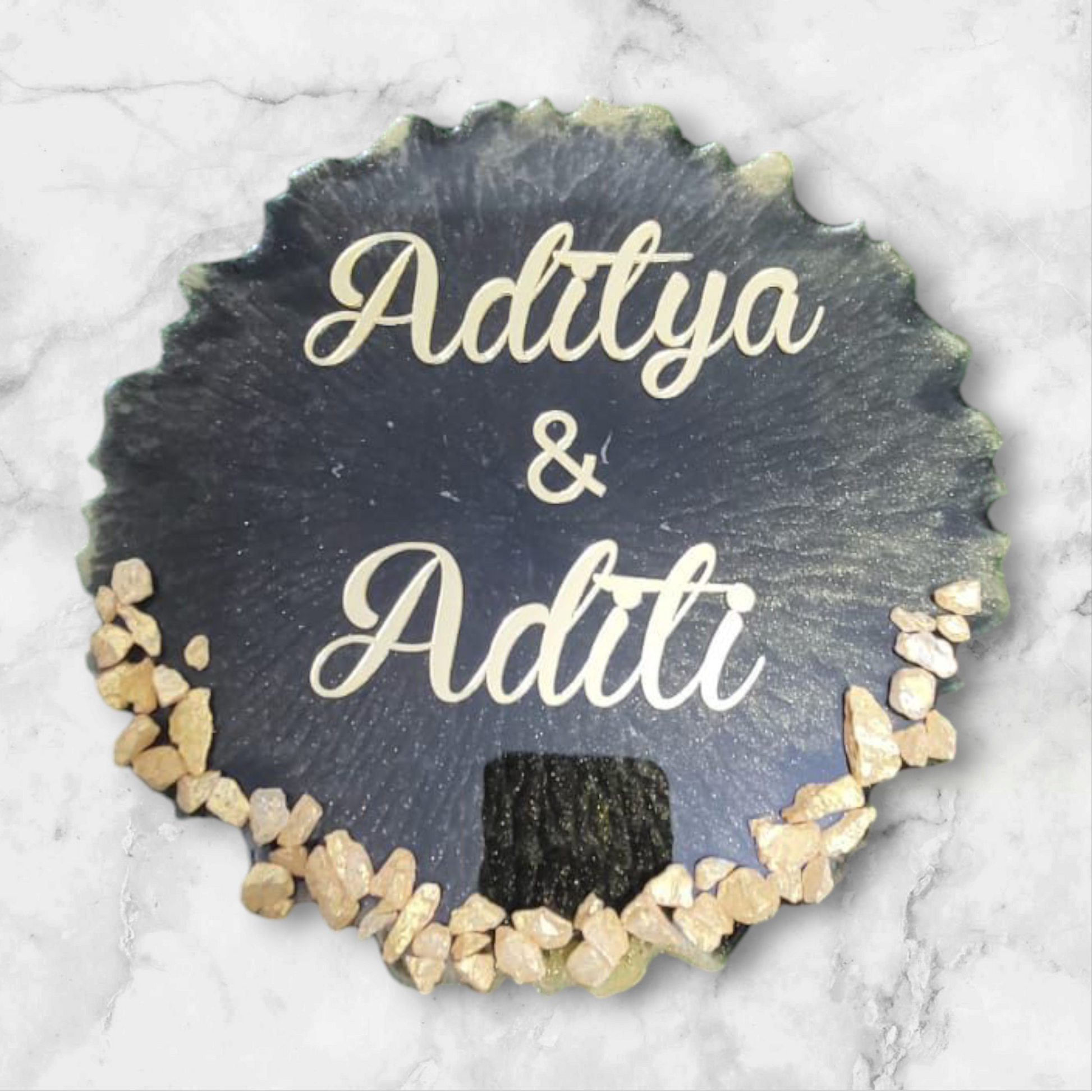 Personalize your space with our Customized Resin Name Plate! Made in an elegant Agate Shape, this 8 inch plate allows you to proudly display your name. Perfect for adding a touch of personality to any room. Get yours today!
