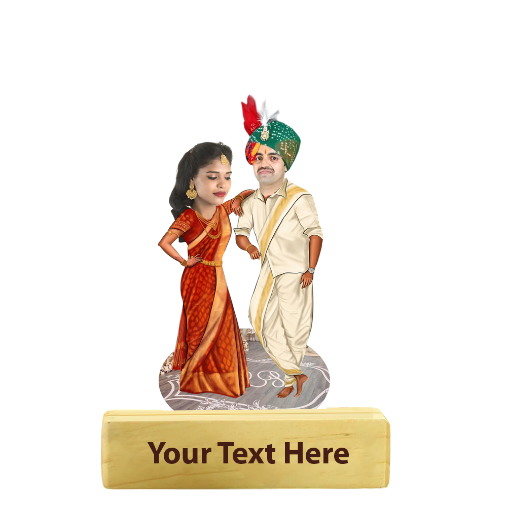 The caricature measures 7 inches in height and 4 inches in length, printed in high quality on a 4 mm wooden board with a shimmer-finished coating to ensure durability, scratch resistance, and waterproofing.