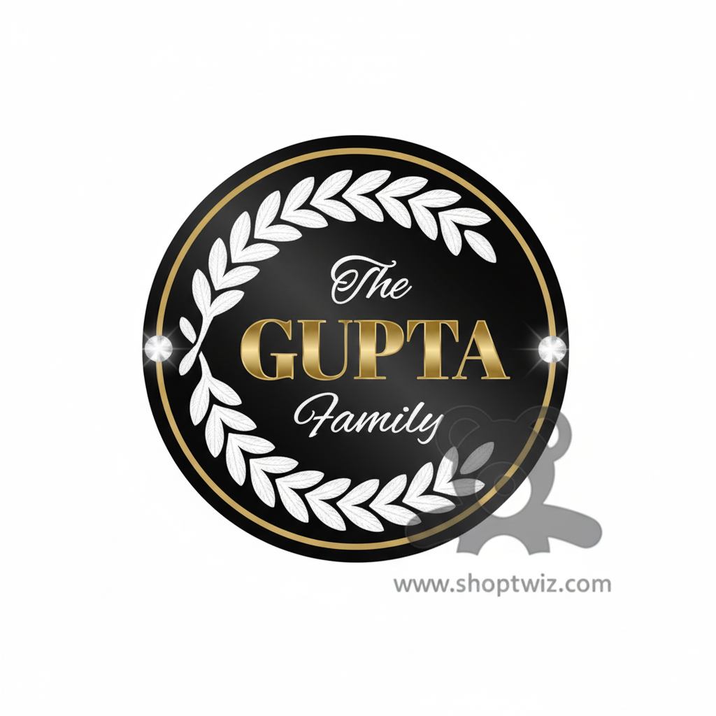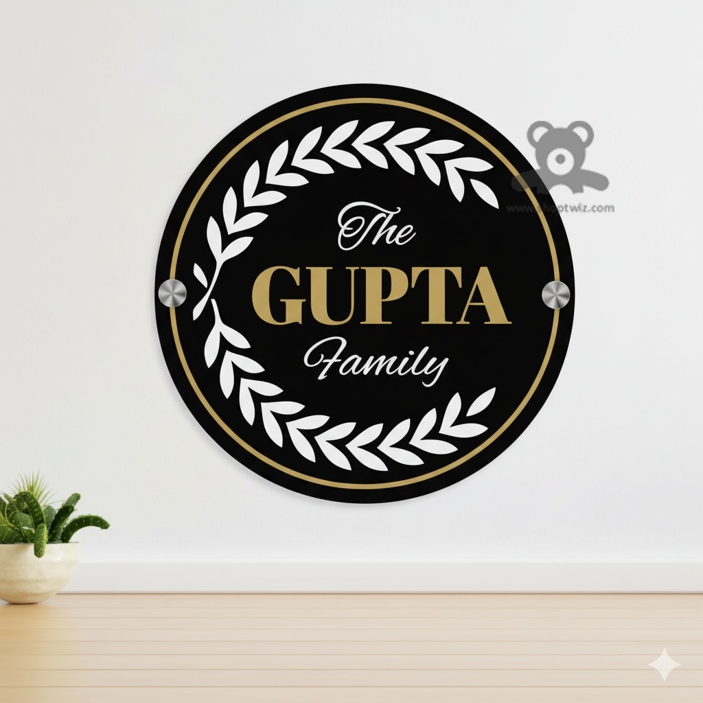 The ShopTwiz Circle Black Acrylic Name Plate combines sleek black acrylic with elegant golden lettering and subtle white leaf accents. Designed for both homes and offices, this name plate offers refined aesthetics and durable construction. Its circular form and artistic detailing provide a distinctive, polished look that ensures clear identification and enhances any entrance with sophistication.