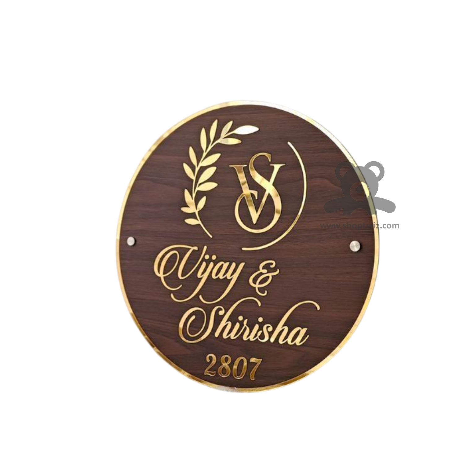 ShopTwiz Circle Wood Golden Border And Latter Name Plate for House and Office