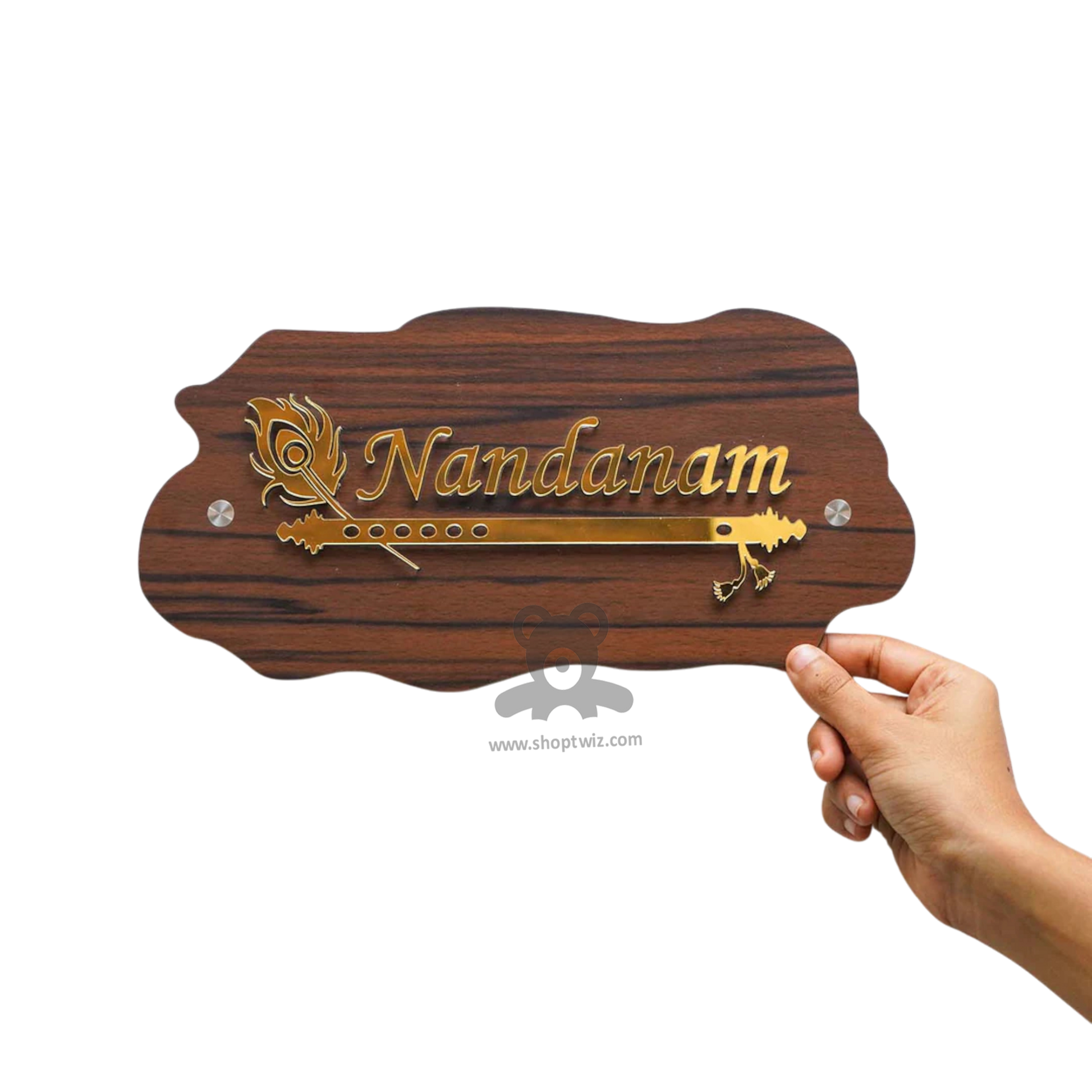 ShopTwiz Rectangle Design Wood Golden Basuri And Letter Name Plate for House and Office