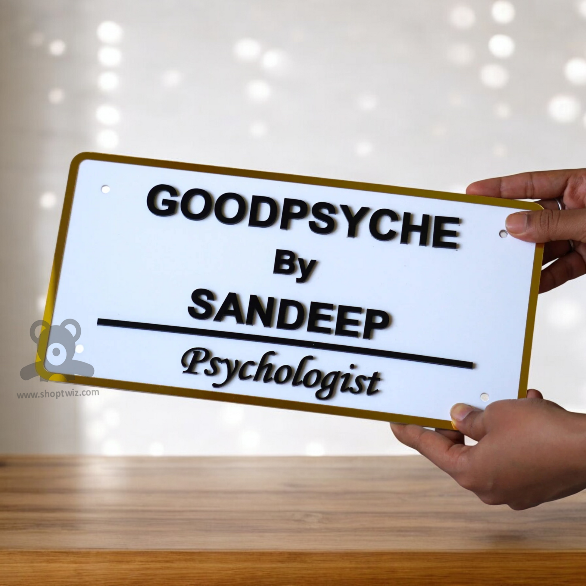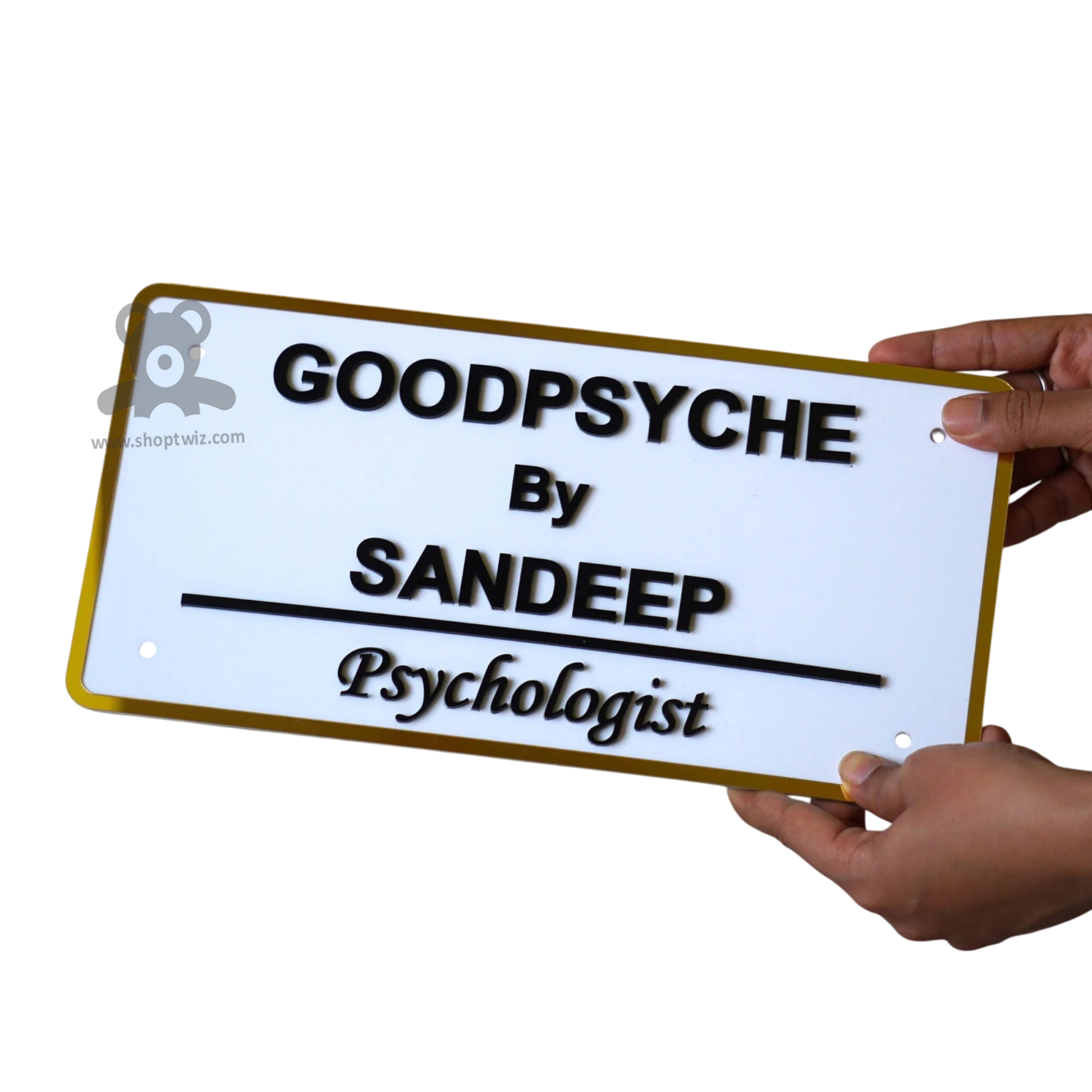 ShopTwiz Rectangle White And Golden Border Black Letter Name Plate for House and Office